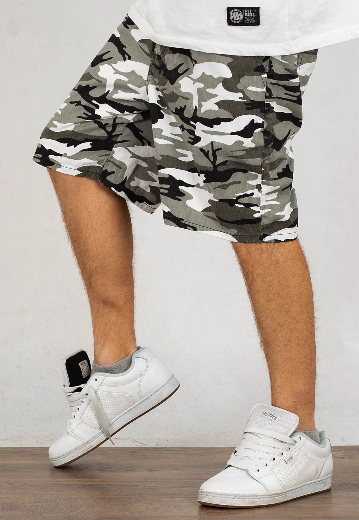 • Spodnie zadrukowane w odcieniu biało-szarym moro.